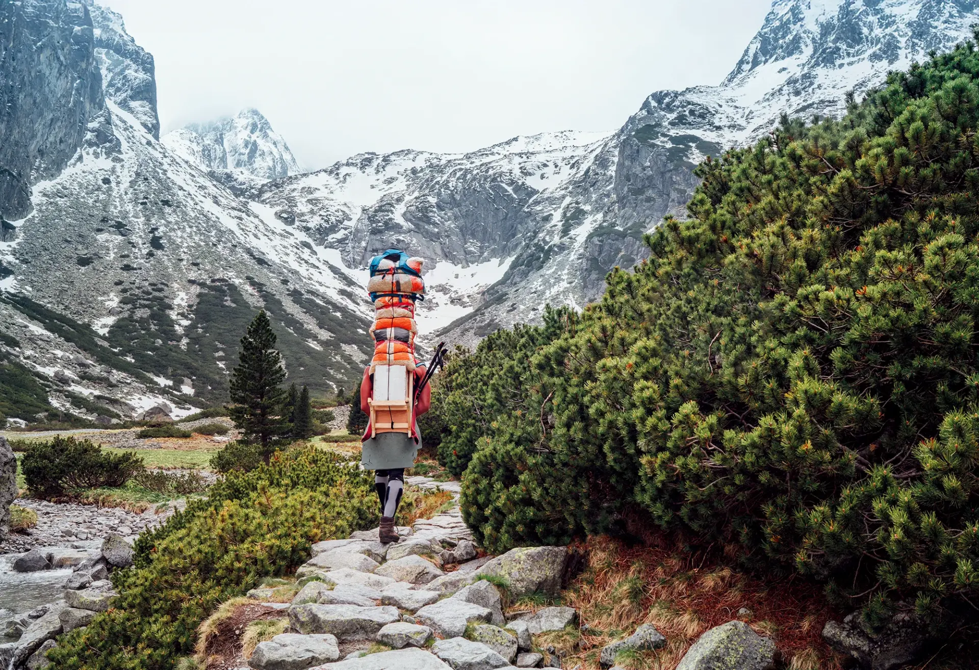 Tijdens het afdalen passeren we een oudere man die met veel bagage op zijn rug omhoogklimt. Nadat in de negentiende eeuw het toerisme op gang kwam en wandelpaden en berghutten werden aangelegd, droegen horský šerpa (bergsherpa’s of bergdragers) grote ladingen van wel 100 kilo aan bouwmaterialen omhoog – en later voorraden eten, drinken en brandstof – over ruige en gevaarlijke bergpaden, in alle weersomstandigheden, stormen en sneeuw trotserend.