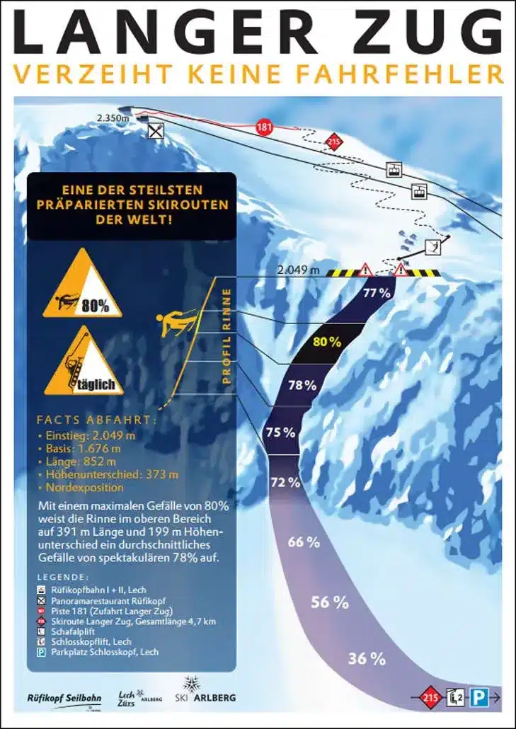 Met een huiveringwekkend hellingspercentage tot 80% bezorgt het eerste deel van deze piste je gegarandeerd knikkende knieën. Binnen een afstand van 852 meter ‘val’ je maar liefst 373 meter naar beneden. Totale lengte: 4700 meter. lechzuers.com