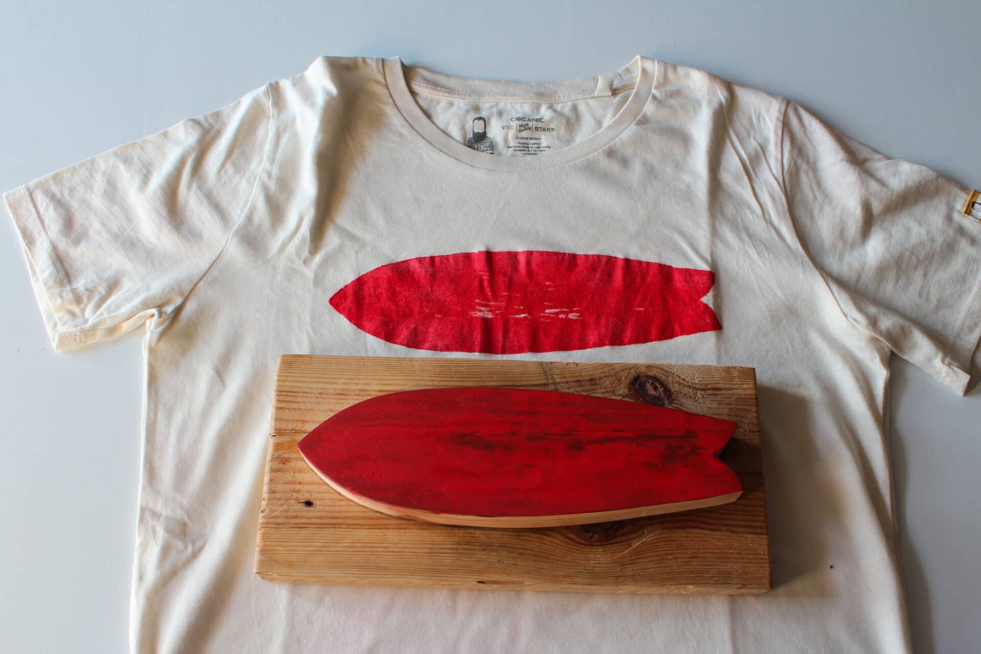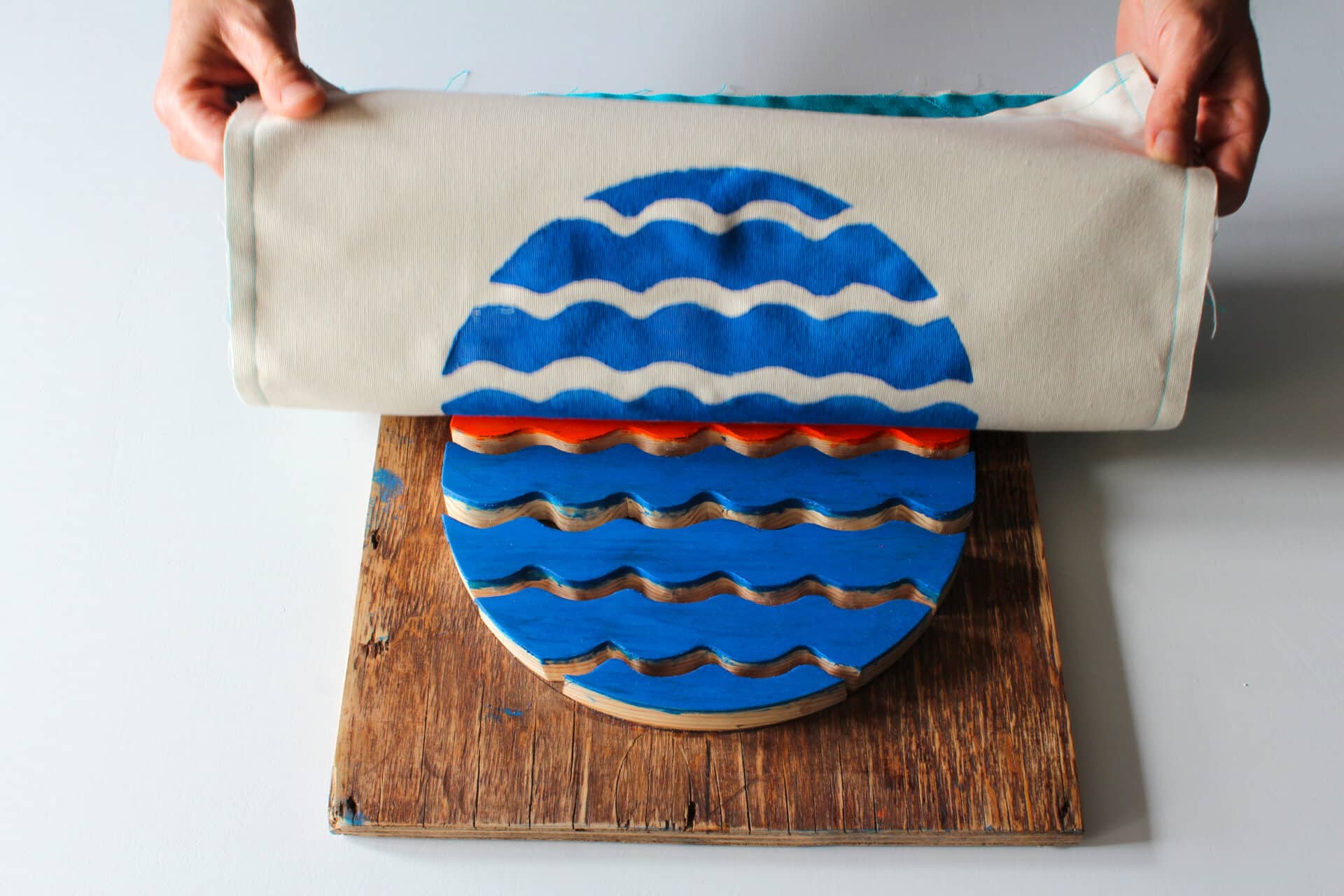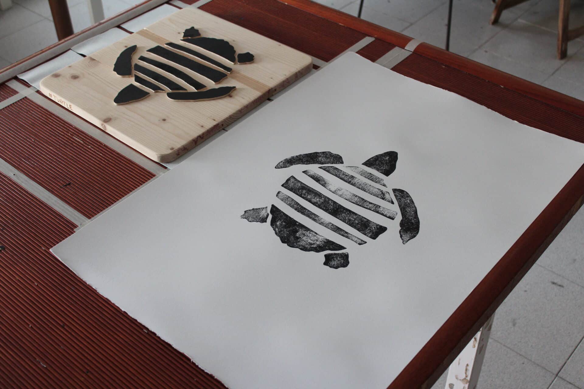 “De eerste druktechniek waarmee ik in Gos Lab begon was xylografie. Van lindehout maak ik houten stempels waarop ik kan staan, net als op een surfboard met tien (hang ten) of vijf tenen (hang five) over de rand. Zo bedruk ik T-shirts, tassen en stoffen. Elk stuk is anders, dankzij de nerven van het hout maar ook de druk die ik met mijn voeten uitoefen heeft effect op het resultaat. Zo wordt ieder stuk uniek.