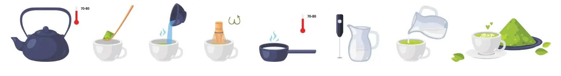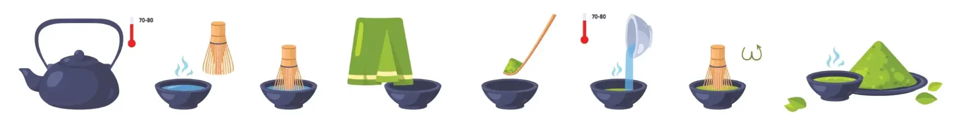 Een kom matcha bereiden is als een mini-meditatie. Je schept een theelepel matcha (2-3 gram) met een maatlepel (chashaku) in een kom (chawan), voegt heet (maar niet kokend) water toe en klopt het met een Een bamboe whisk (chasen) tot een schuimige, romige drank. Bamboe is beter dan een ijzeren lepel vanwege de ijzersmaak die een lepel afgeeft. Er zijn meerdere manieren om van matcha te genieten — puur of als onderdeel van een creatief recept.