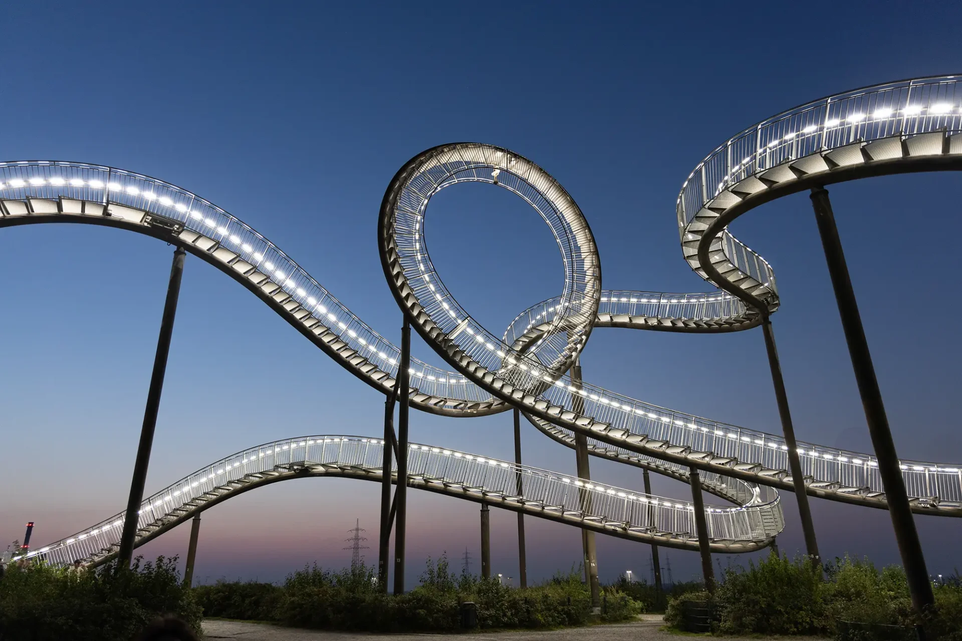 In het Ruhrgebied hebben zo’n 20 voormalige stortplaatsen van afval uit de mijnbouwtijd een tweede leven gekregen als ‘groene berg’. Hier overheen is een wandelnetwerk van 185 km en twaalf themaroutes neergelegd. Van fauna en flora tot en met kunst en technologie, en van kleurrijke totems tot en met een bovenmaatse rode mijnwerkerslamp of een stalen achtbaan – Tiger und Turtle – op de top. Alle kunstwerken op de stortplaatsen zijn unieke herkenningspunten.