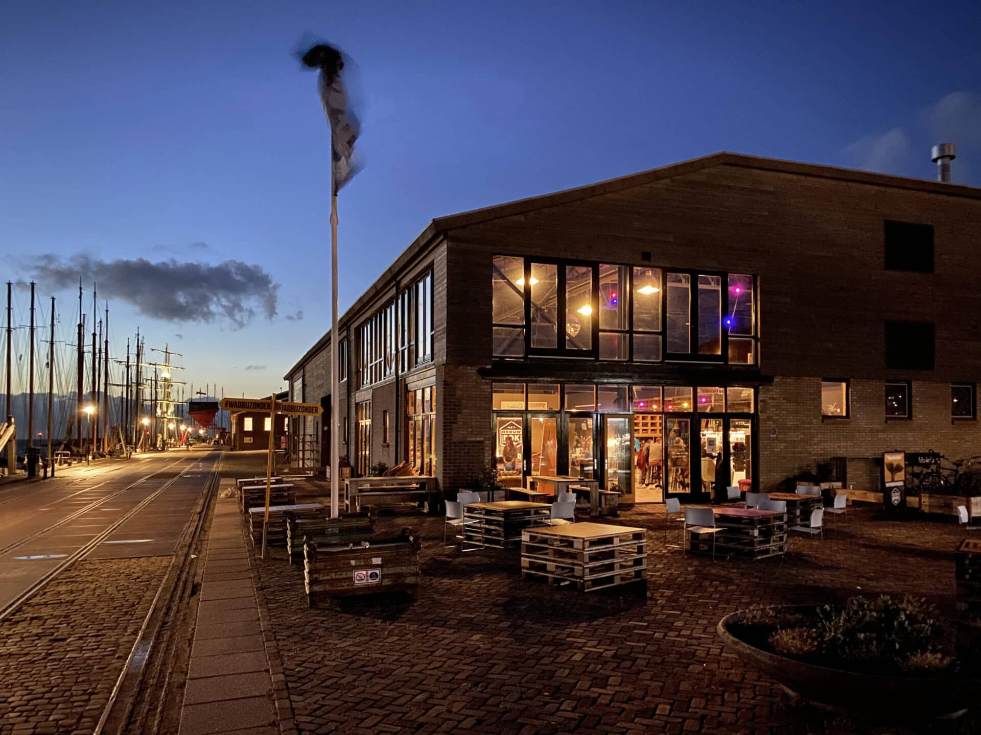 Het terras van Havenbrouwerij Het Brouwdok in Harlingen bij het vallen van de avond. Getipt in Salt '5 avontuurlijke hotspots aan het water'.