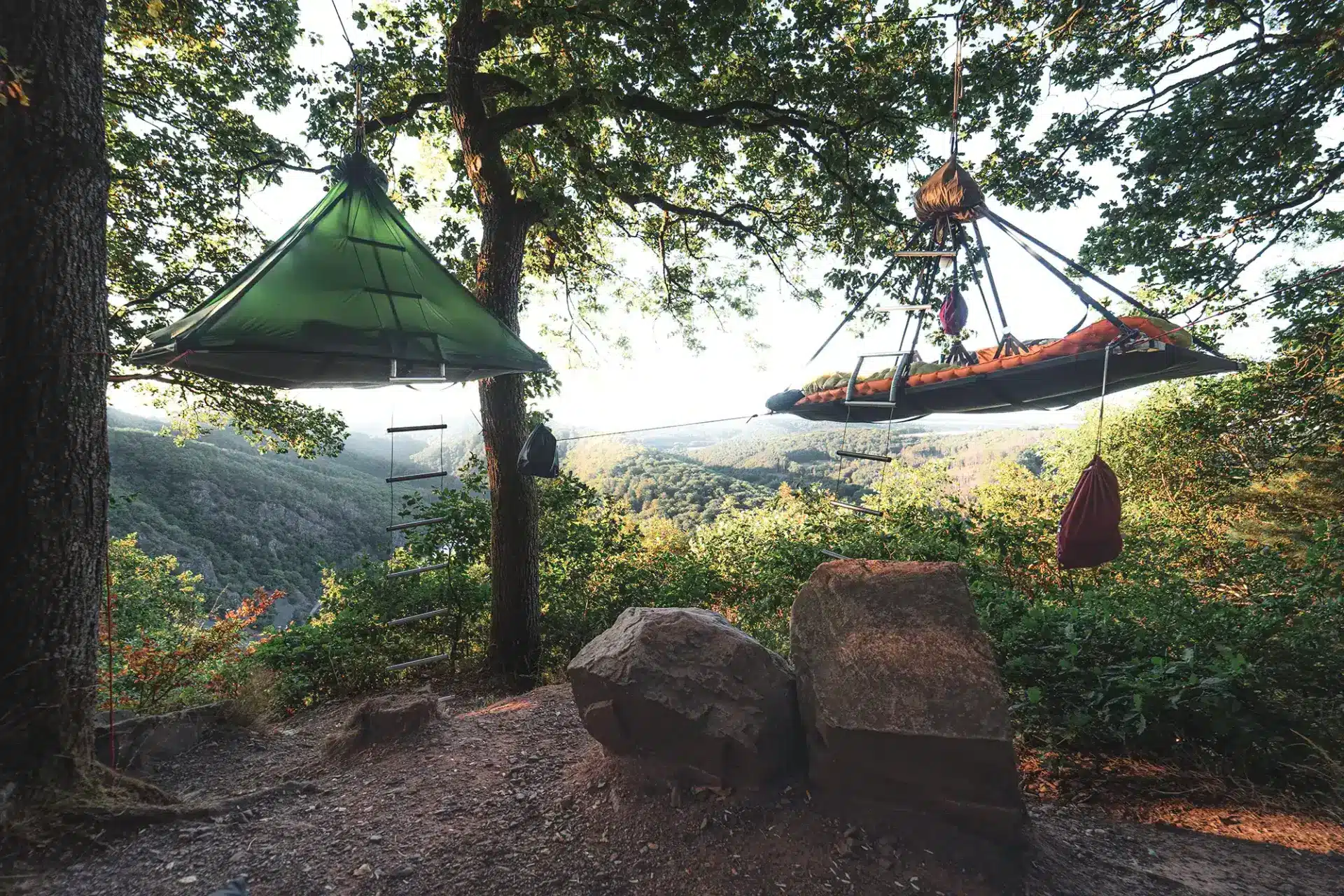 - Op het hoogste punt van het uitzicht op de Saarschleife, de Cloef, hangt tussen de bomen de Cloefhänger, een serie hangtenten met een vrij uitzicht over de Saarschleife; mooier en avontuurlijker gaat een overnachting niet worden. Cloefhaenger.com. Voor liefhebbers van kleinschalige campings, midden in de natuur en zonder vaste plekken, is Landgut Girtenmühle dé plek om je anker uit te gooien. landgutgirtenmuehle.de