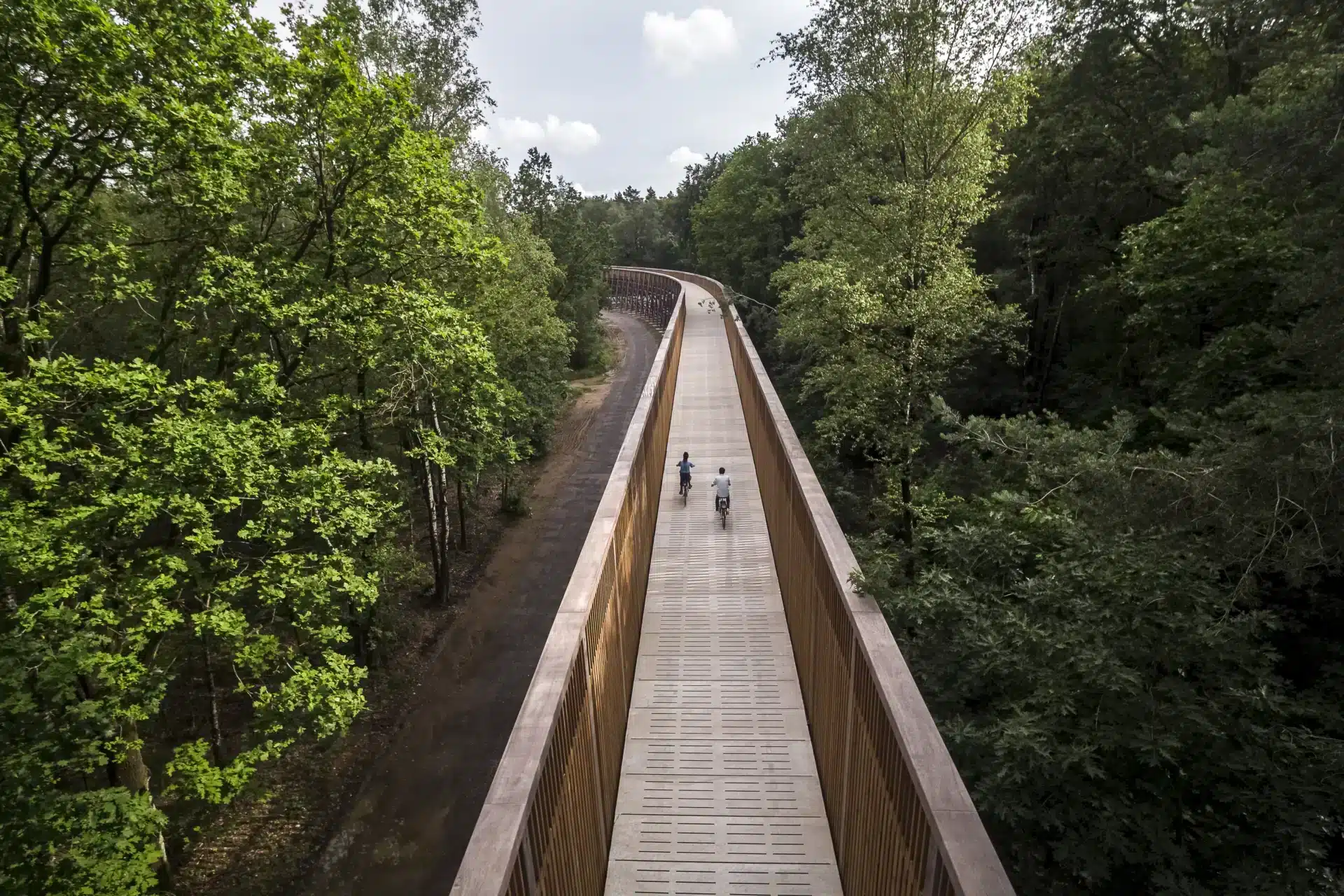 Ruim 22 kilometer naar het oosten – tussen knooppunten 550 en 551 – stuit je op ‘Fietsen door de Heide’: een fotogenieke fietsbrug die 300 meter lang boven de Mechelse Heide zweeft. Zo’n 45 kilometer noordelijker wacht bij knooppunt 272 ook nog eens ‘Fietsen door de Bomen’. Op dit duizelingwekkende pad tuf je tot op 10 meter hoogte een dubbel rondje door de kruinen van Vlaanderens grootste bos.