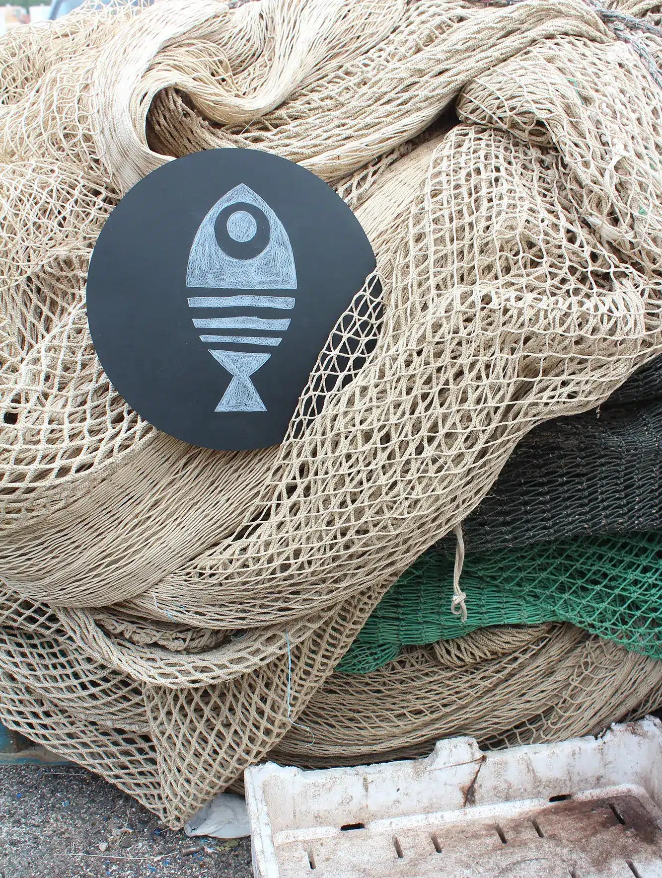 Een vis in een voorouderlijke vorm, omsloten door een cirkel die een visnet doorboort. Fabio: “Een cirkel kent geen begin of einde, het symboliseert continuïteit, eeuwigheid, oneindigheid, de stroom van tijd en leven. Dat betekent ook vissen op een duurzame manier waarmee populaties in stand kunnen worden gehouden en bijvangst wordt vermeden. Een ander groot probleem is de aanwezigheid van spooknetten die overal in de oceaan zweven en waar vele dieren (ook vogels die op vis jagen) in vast komen te zetten. Fabio ‘vangt’ beide problemen in dit ontwerp. Bedrukt in feloranje en turquoise, de meest voorkomende kleuren van spooknetten.