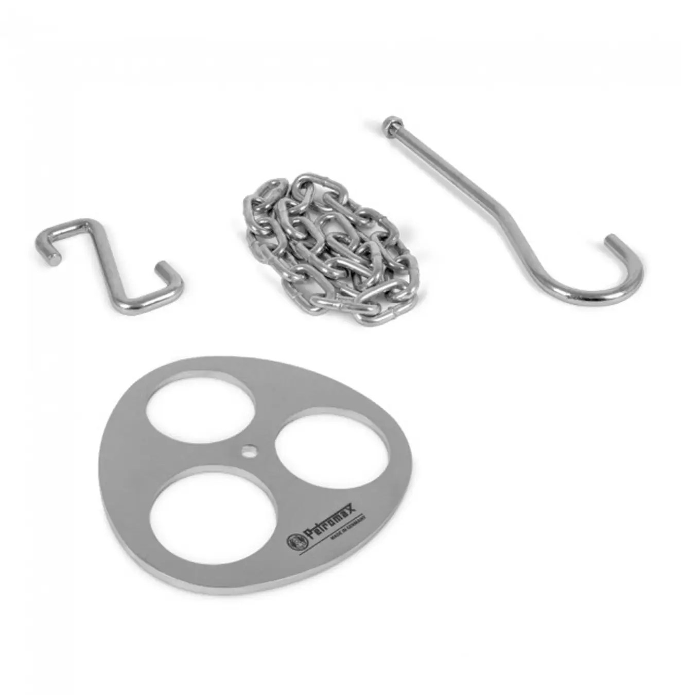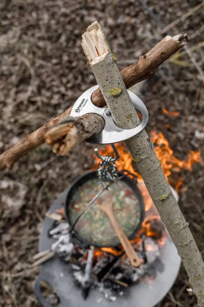 Deze lichte, roestvrijstalen schijf is de perfecte basis voor een zelfgemaakte driepoot van takken. De opening van 5.5cm maakt het eenvoudig om takken door de ronde gaten te steken en stevig vast te draaien. Hiermee creëer je een stabiele driepoot voor al je buitenkookavonturen. Hang eenvoudig je Dutch Oven of theeketel boven een knetterend kampvuur met behulp van de twee haken en ketting. De verstelbare kettinglengte geeft je volledige controle over de warmtebron.